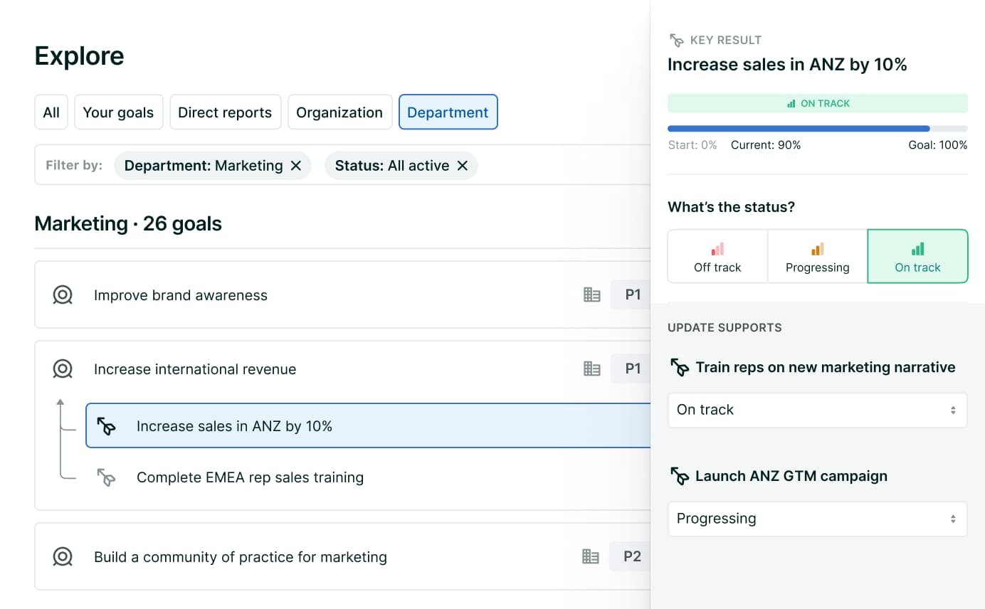 - Goal setting with OKRs: Helps companies set and track Objectives and Key Results (OKRs) and connect individuals’ work to broader team or company goals.