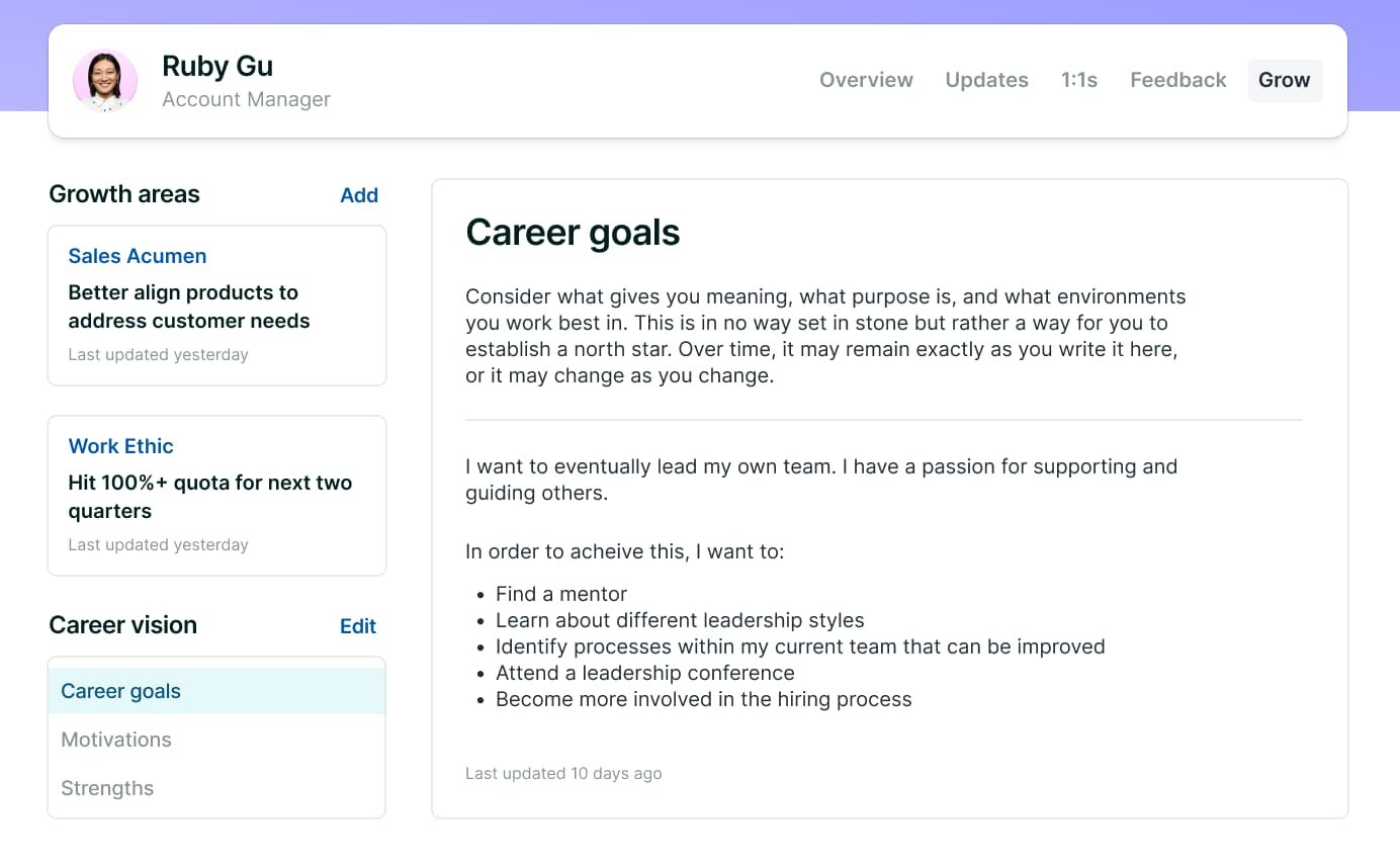 - 1:1s, goal tracking, and updates from anywhere: The app lets managers and employees manage 1:1s, view active goals and progress, set agenda items, and view past 1:1s.