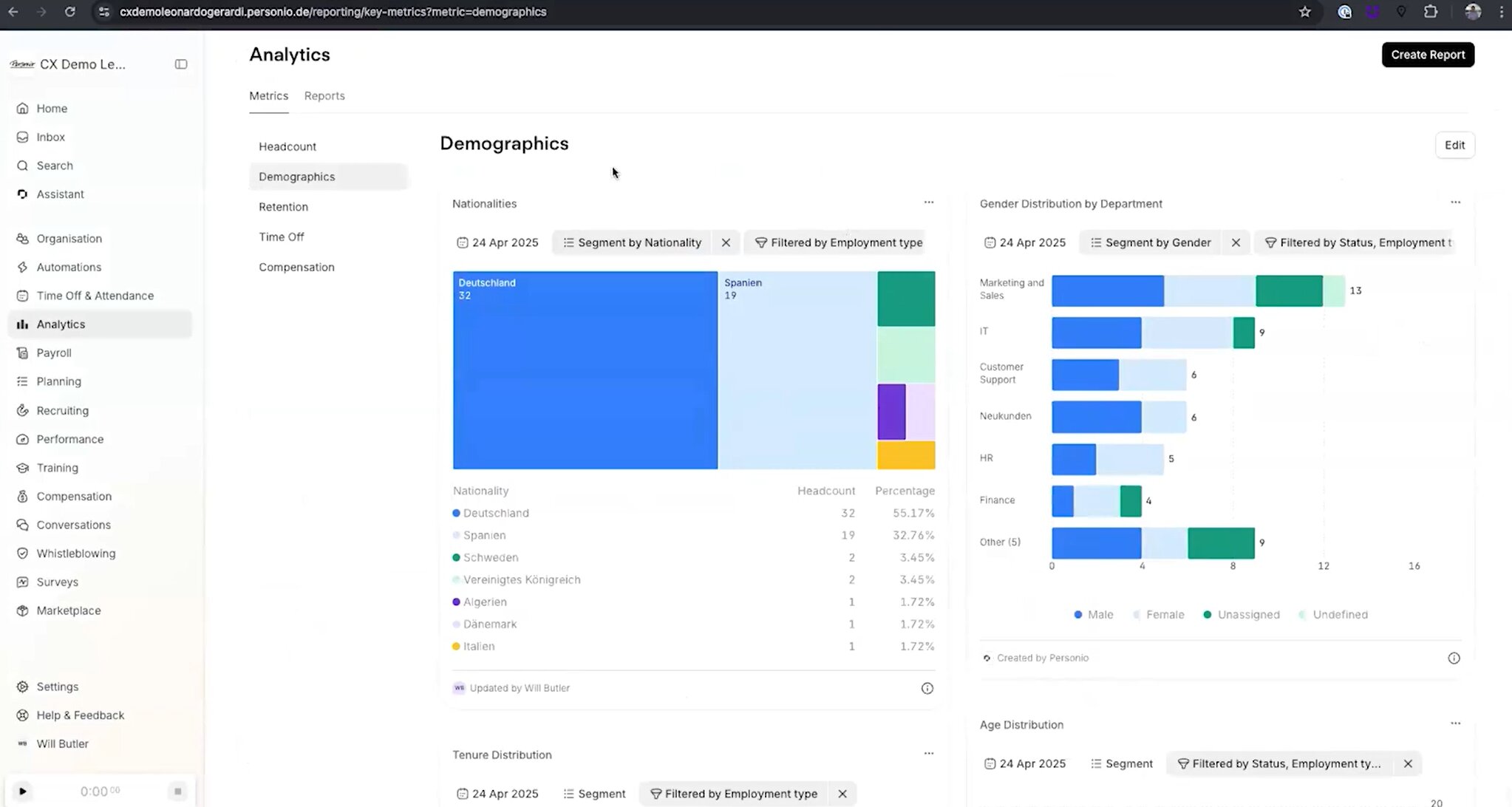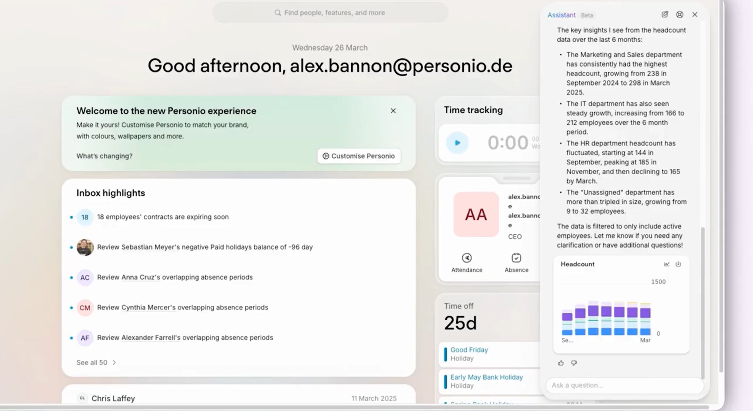 Personio Assistant is an AI-powered chatbot within Personio, offering insights about your organization and answering questions to enhance your HR management. It helps identify trends, highlight concerns, and suggest ways to improve HR practices.