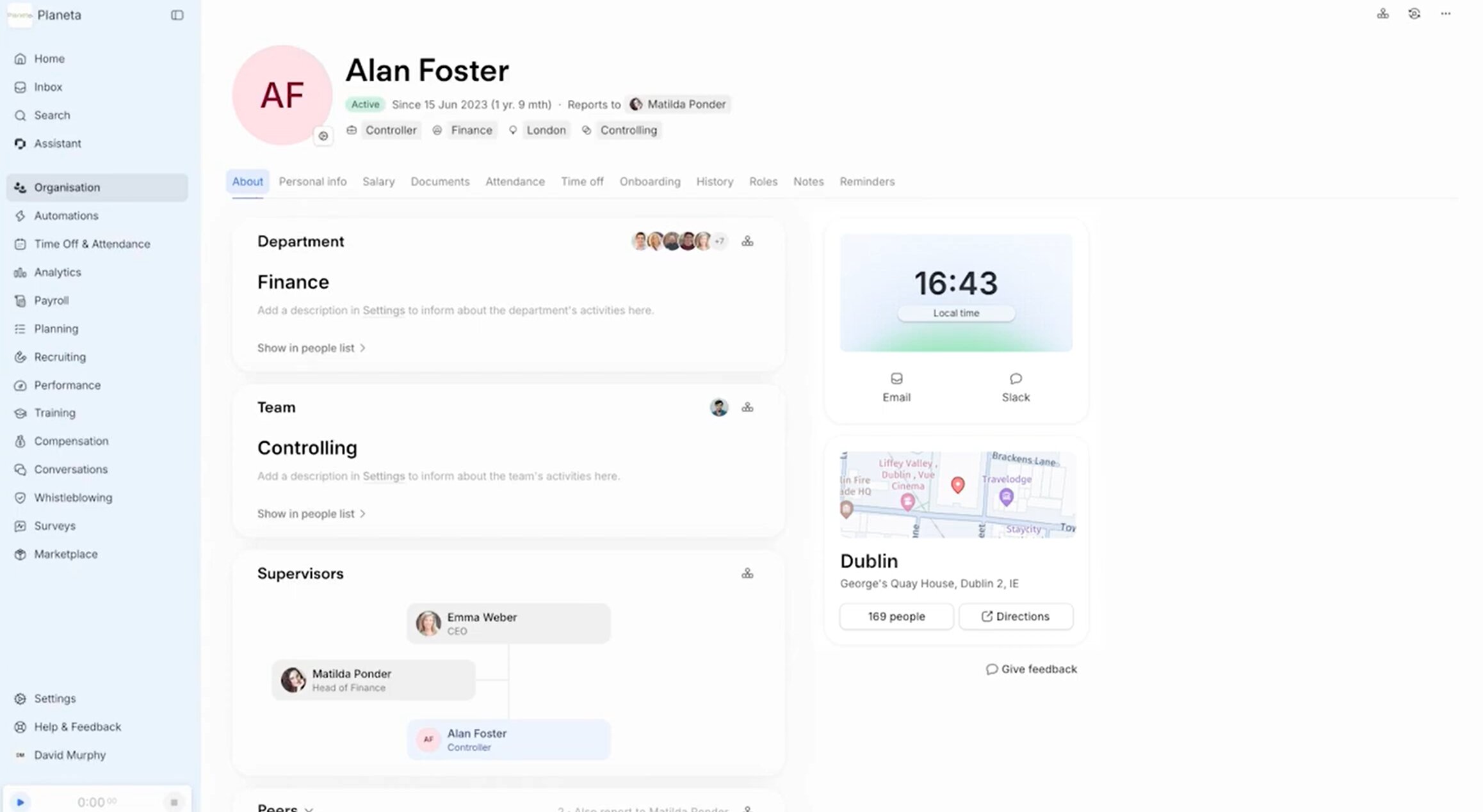 - Centralized people data: All employee records, documents, and job profiles live in one secure system. This unified database supports GDPR-compliant data handling and provides a single source of truth for reporting and analytics.