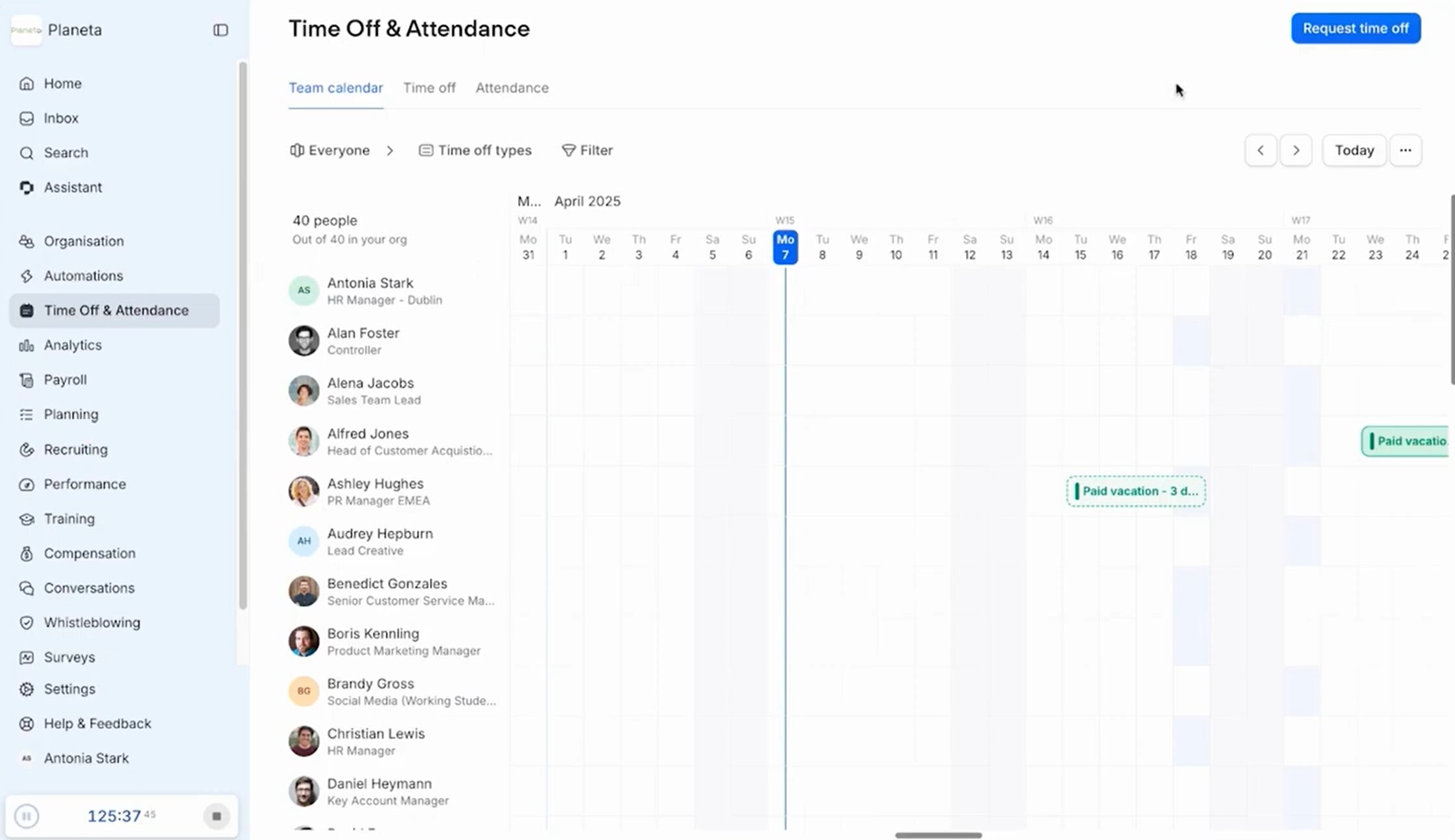 - Time & absence management: Teams track work hours and vacations in real time. Dashboards surface headcount trends, upcoming absences, and leave balances so managers can plan capacity without spreadsheets.